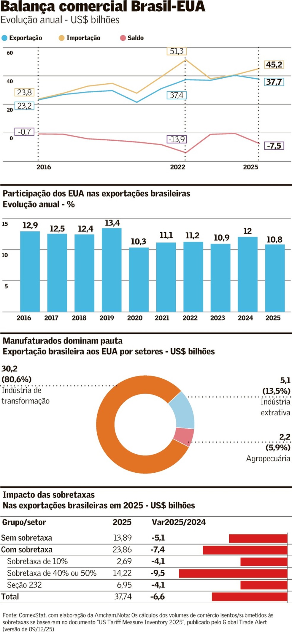 Em 2025, mostra o estudo da Amcham, as exportações industriais do Brasil aos EUA caíram 4,2% ante 2024, a primeira queda de vendas do setor desde 2020. Mesmo assim o mercado americano permanece como o principal destino das exportações da indústria brasileira, com 16% do total, à frente da UE e do Mercosul.